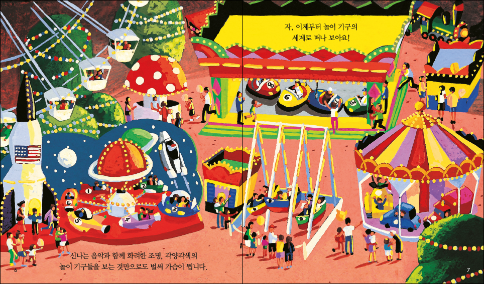 신나는 음악과 함께 화려한 조명, 회전목마, 유령 열차, 롤러코스터 등